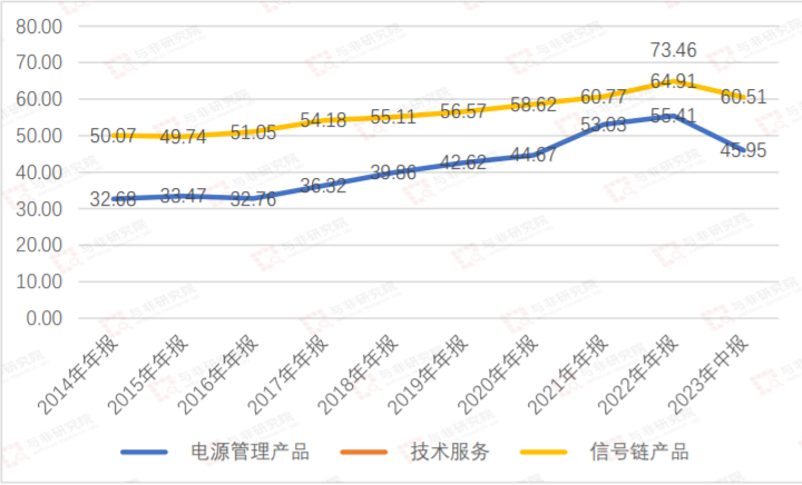 信号链芯片由2014年50.07%提升至2022年64.91%,2023年中下降至60.51%;技术服务类毛利率2022年为73.46%。