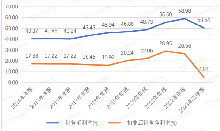 2014年-2022年公司毛利率逐步增长,由40.37%增长到58.98%;扣非净利率由17.38%增长至26.56%。2023年前三季度,毛利率下降至50.54%,扣非净利率降幅较大至4.97%。