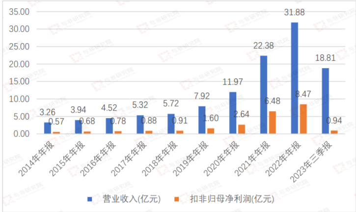 从2014年至2022年,公司营收和利润一直保持增长,营收由3.26亿元增长至31.88亿元,近9倍;利润由0.57亿元增长至8.47亿元,近14倍。2020年至2022年增速最为强劲,2023年遇到瓶颈,出现一定的下滑。