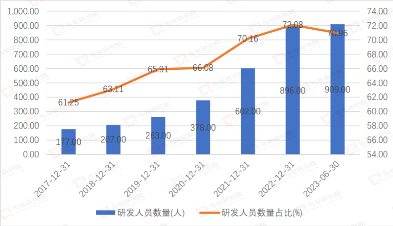 公司研发投入逐年提升,研发人员数量也逐年增长,由2017年177人增长至2022年896人,研发人员占比由2017年61.25%提升至2023年72.08%。
