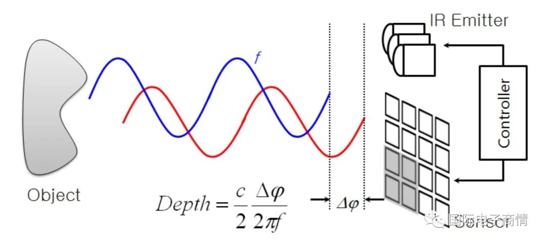 所以以英飞凌和索尼为代表的cwToF(连续波ToF)在移动消费市场是更占据主流地位的。cwToF方法在实施中,发射端会针对照明应用一个周期性的调制信号,最终在光返回到图像传感器时,针对反射光检测相位差,并算得距离。现在我们常说的iToF,很多时候也特指cwToF。