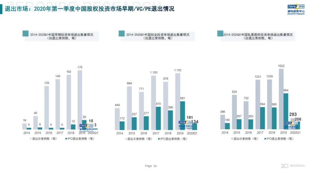 受疫情影响,全球经济受到冲击。2020年第一季度,股权投资市场募资、投资、退出均受到不同程度的影响。第一季度新募基金总金额为2,071.58亿,同比下降19.8%,新募基金数量428支,同比下降30.9%。投资案例数1,357起,同比下降37.1%,投资总金额1,103.67亿元,同比下降38.4%。股权投资市场退出共发生489笔,同比下降10.1%,得益于科创板的设立,被投企业IPO共发生343笔,同比上升64.1%。