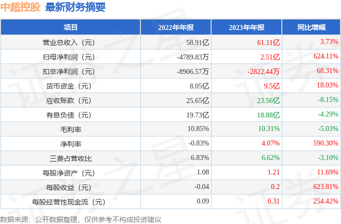 据证券之星公开数据整理,近期中超控股(002471)发布2023年年报。根据财报显示,本报告期中中超控股营收净利润同比双双增长。截至本报告期末,公司营业总收入61.11亿元,同比上升3.73%,归母净利润2.51亿元,同比上升624.11%。按单季度数据看,第四季度营业总收入18.7亿元,同比上升10.88%,第四季度归母净利润-17.62万元,同比上升99.02%。