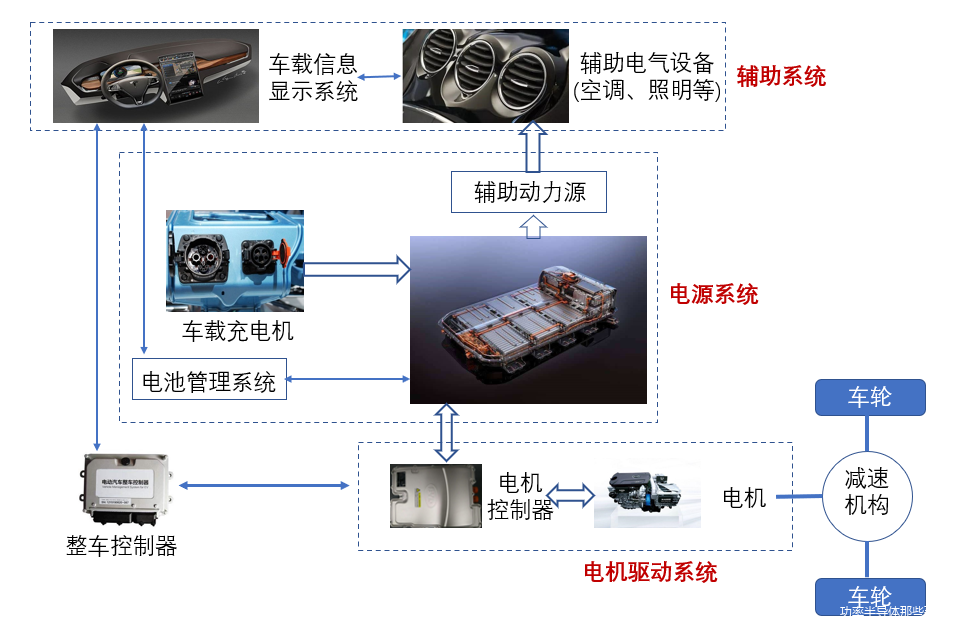 纯电动汽车主要包括:电源系统、电机驱动系统、整车控制器和辅助系统。相对于传动内燃机汽车,由于取消了发动机,所以底盘上的传动机构相应地发生改变,增加了电源系统和电机驱动系统。