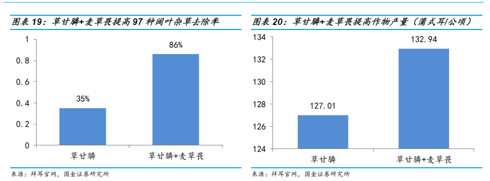 通过拜耳实验,麦草畏+草甘膦复配,能够提高杂草去除率和提高作物产量。针对97中阔叶杂草,杂草去除率提高51%。在拜耳研究的农作物中,产量提高5.9蒲式耳/公顷。