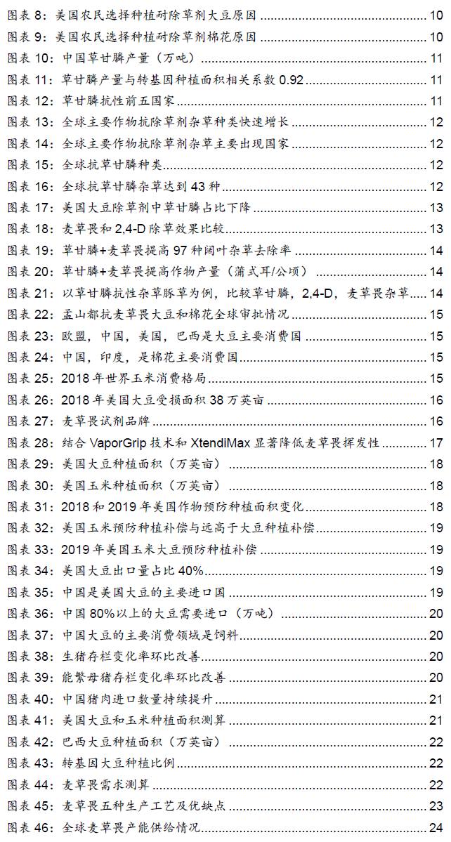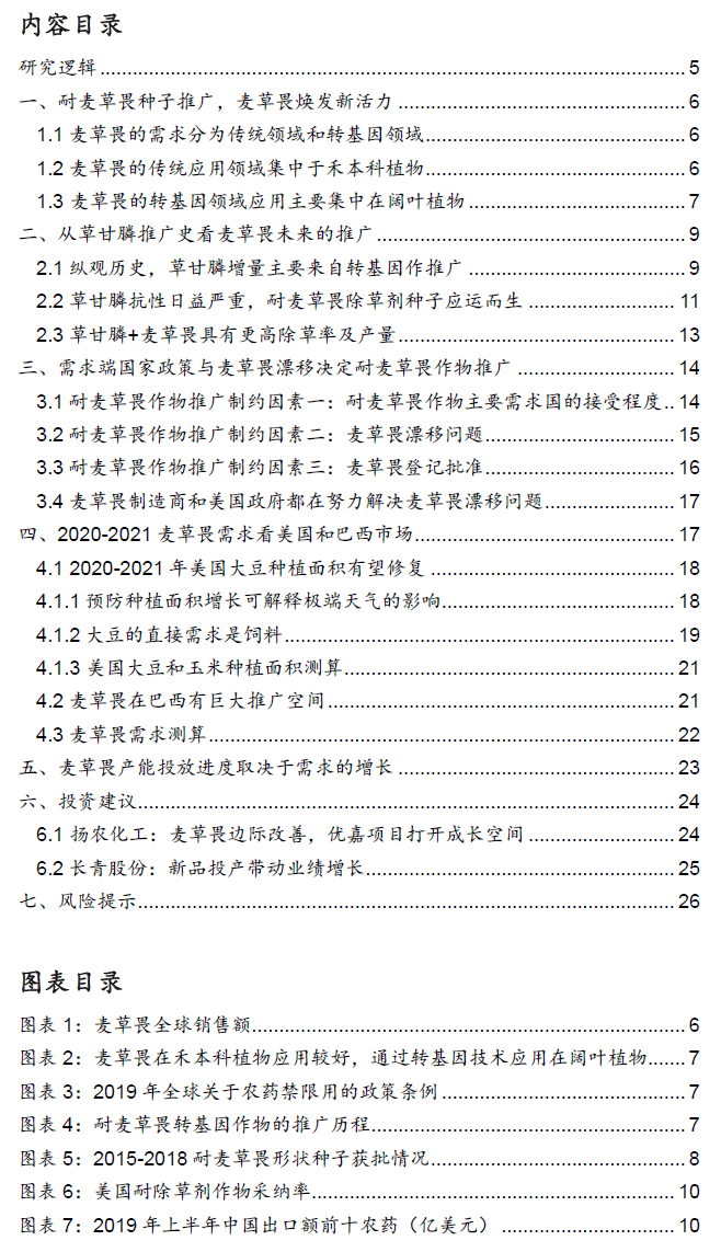 长期看,麦草畏的需求量将随着耐麦草畏转基因作物的推广而持续增长;短期看,伴随着美国大豆种植面积持续修复,耐麦草畏大豆种子在巴西的推广,麦草畏需求量会持续增长,我们建议关注国内优质农药企业扬农化工(麦草畏产能2.5万吨,长期受益于转基因种子的发展);长青股份(现有麦草畏产能5000吨,2020年下半年麦草畏6000吨储备项目将逐步实施)。