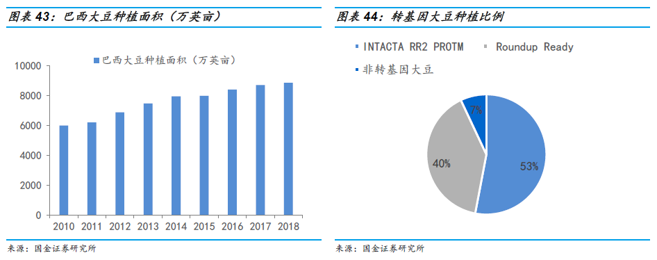 麦草畏在巴西有巨大的推广空间。2018年,巴西大豆种植面积8836万英亩,其中转基因大豆的种植面积占比到93%,非转基因大豆的种植面积占比7%,巴西目前转基因大豆种子主要使用的是Roundup Ready(抗草甘膦)Intacta RR2 Pro(抗草甘膦),其中Roundup Ready种子在大豆种植面积中占比40%,Intacta RR2 Pro种子在大豆种植面积中占比53%。