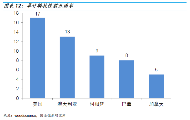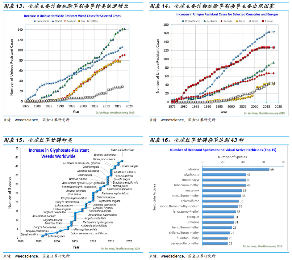 草甘膦抗性日益严重,耐麦草畏除草剂种子应运而生。抗草甘膦杂草不仅会严重影响实施免耕及窄行密植,同时会降低农作物产量。截止到2019年,抗草甘膦杂草达到41种。种植抗草甘膦作物较早的国家,均出现大量抗草甘膦杂草。孟山都推出耐麦草畏+草甘膦种子成为解决草甘膦抗性的主要方法之一。