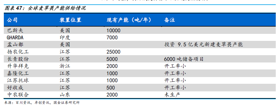 未来麦草畏产能的投放进度与取决于麦草畏的推广程度。2017-2018年,由于麦草畏推广顺利,巴斯夫和印度GHARDA分别扩产产能,根据草根调研情况,巴斯夫实际产量约增加了3000吨左右,印度GHARDA实际产量增加2000吨左右。2016年4月孟山都董事会曾批准出资9.75亿美元扩建位于美国的麦草畏工厂产能,该项目计划于2019年年中完成,但从拜耳2019年中报中看出,麦草畏产能仍未建设完成,未来的建设进度主要取决于麦草畏市场的推广情况。我们认为,麦草畏产能未来的投放进度将匹配麦草畏的需求,国内的麦草畏厂家多出口到国际农化巨头,价格方面以长单为主,实际成交价格难以出现大幅波动。