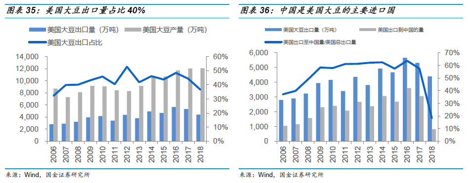 中国是美国最大的大豆出口国。美国2018年大豆的产量12052万吨,其中,94%以上是转基因大豆,出口比例为37%。近年来,美国大豆的出口占比在美国大豆的产量在40%以上,而中国是美国大豆的主要进口国。
