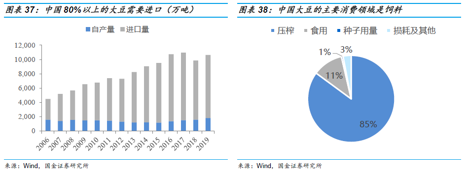 中国是主要大豆进口国,近年来中国大豆进口占比在80%左右。中国进口大豆大部分用于产生饲料,据SOY.ORG报道,从美国进口的大豆全部被用于饲料压榨;从南美进口的大豆80%用于饲料压榨,而中国非转基因大豆有90%以上用于大豆食品生产。从中国大豆从下游消费结构来看,中国大豆的主要消费领域是压榨成豆粕,供饲料使用。