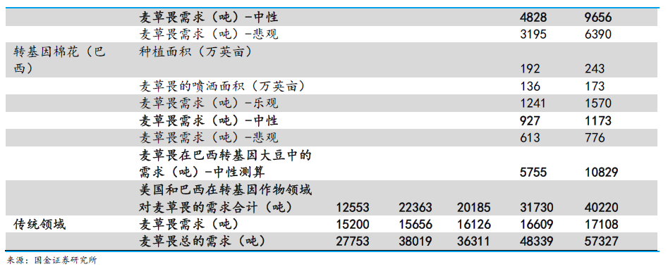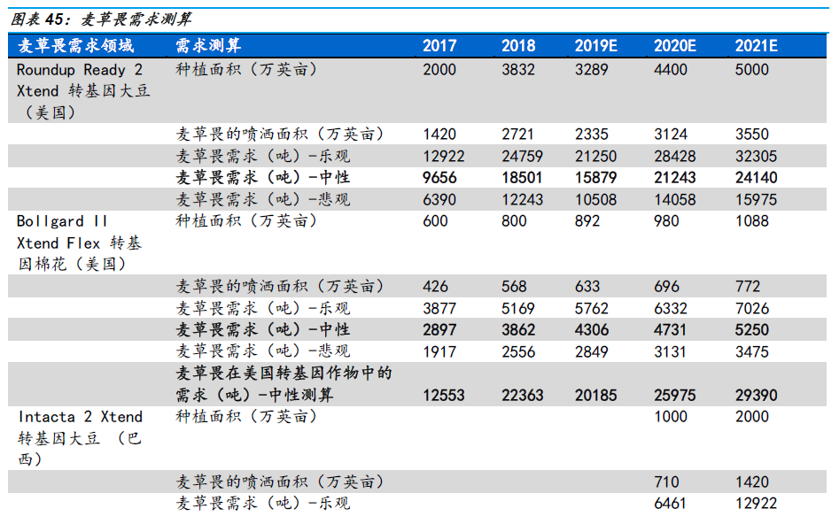 我们搭建模型来测算转基因作物的推广对麦草畏的新增需求量,模型有如下假设:(1)传统领域麦草畏的需求增速为3%;(2)2020-2021年转基因种子在巴西的渗透率类似于2016-2018年转基因种子在美国的渗透率;(3)麦草畏在抗麦草畏种子种植面积中的喷洒比例类似于2018年美国密西西比州的喷洒比例;(4)转基因作物对麦草畏施用量为0.45-0.91kg/英亩,平均用量0.68kg/英亩。