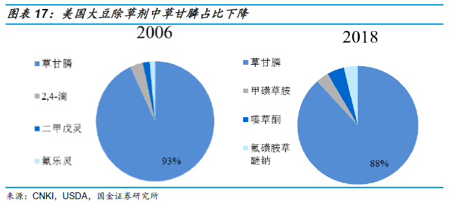 为解决草甘膦抗性,美国农民需要加大其他农药用量。与2006年对比,2018年美国大豆除草剂中前四名除草剂中,草甘膦占比从93%降到了88%;咪草酮,甲磺草胺,氟磺胺草醚钠用量大幅提升。