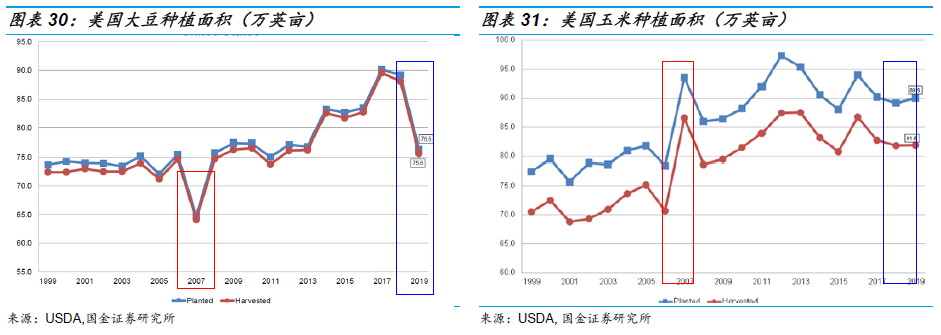 纵观美国大豆种植面积历史,从1999年到2019年美国大豆种植面积一共出现两次大面积下滑,分别是2007年和2019年。2007年,由于美国乙醇行业玉米原料的需求持续走高, 加上玉米出口强劲增长,相较于大豆,农户选择种植了更多的玉米,2007年全美玉米种植面积将比去年增长20%。2008年大豆需求持续增加,美国大豆价格达到11.4美元/蒲式耳,增长45%,大豆种植面积快速回升。对比2007年,2019大豆面积下滑将近1200万英亩,同比下滑13.6%。我们认为大豆种植面积下滑的主要原因分三个方面:1.极端天气的影响;2.下游饲料需求的影响;3.贸易战的影响。