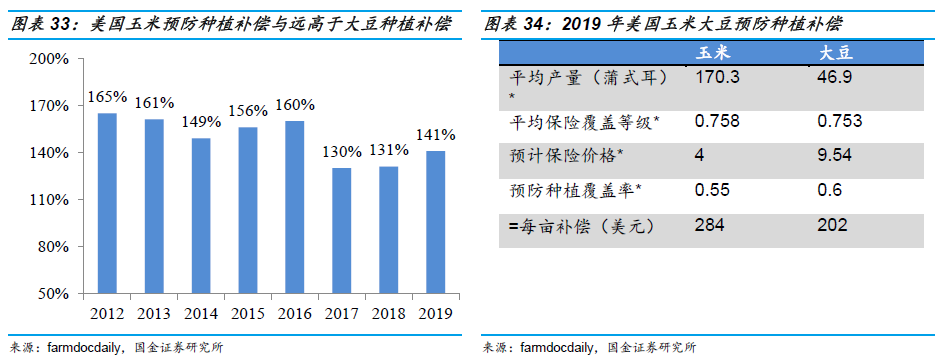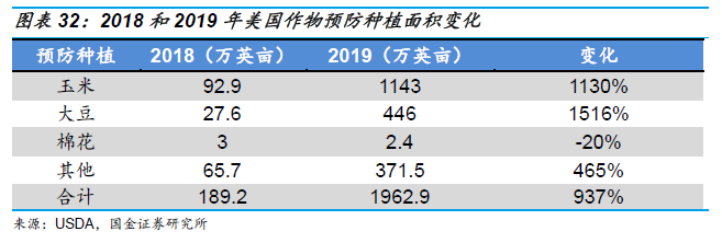 根据美国农业部数据,2019年玉米预防种植申请达到1140万英亩,同比增加1130%;大豆预防种植面积达到446万英亩,同比增加1516%。