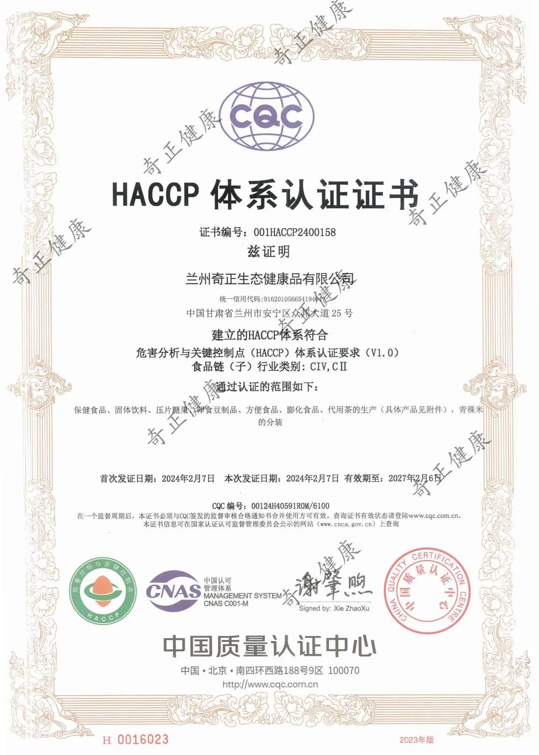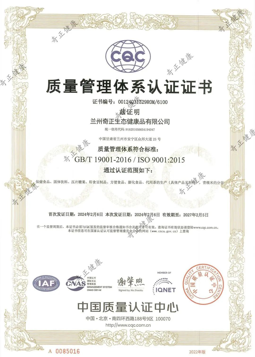 2024年02月07日,兰州奇正生态健康品有限公司取得三体系的认证证书。