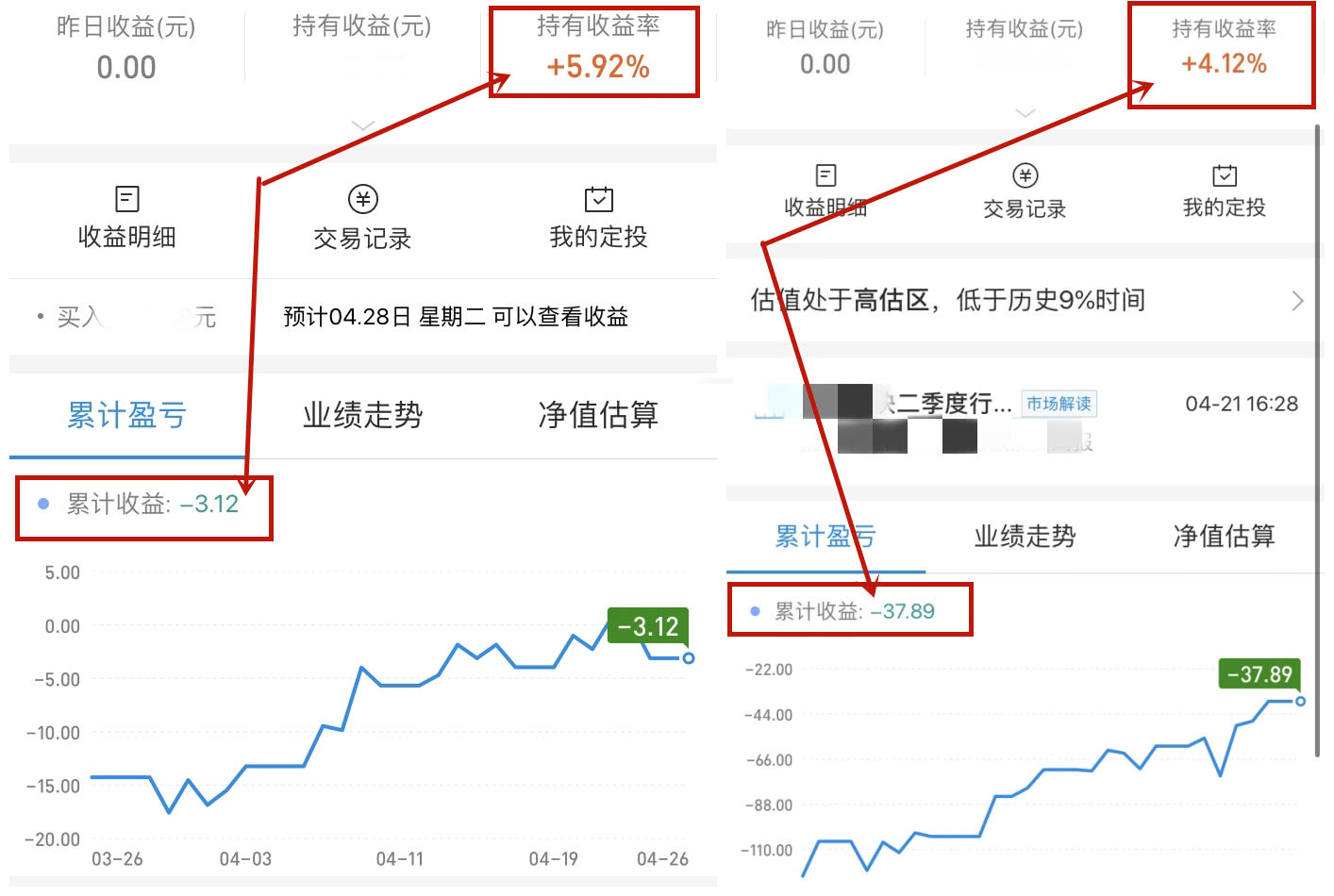 其次是,如果有买也有卖,那么收益率10%,就不一定是赚钱状态了,比如我自己持有的这两只基金,从截图中可以看到,持有收益率分别是5.92%和4.12%,虽然持有收益率为正,但累计收益却是负数。
