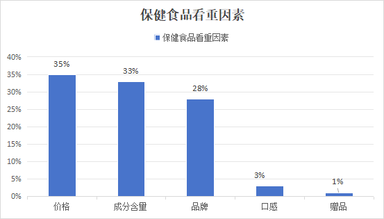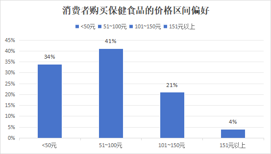 消费者在选择保健食品时,更看重的因素排名最高的是:价格35%、成分含量33%,品牌28%,口感和赠品仅作为辅助因素。在保健食品价格区间上,41%的受访者认为51-100元的保健食品更易于接受,低于50元的区间也有34%的受访者选择。这与百合股份持续倡导的平价快消理念不谋而合。