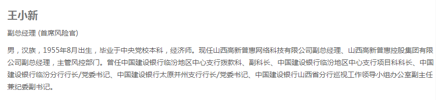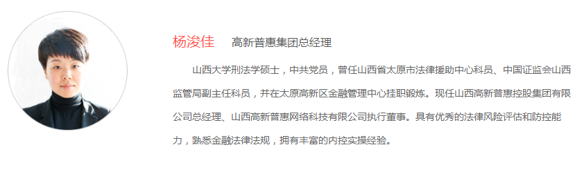 根据高新普惠公布的简历显示,法人代表杨浚佳(女)1986年生,毕业于山西大学法学院刑法专业,硕士研究生学历。曾任山西省太原市法律援助中心科员、中国证监会山西监管局副主任科员、太原高新区金融管理中心挂职锻炼。现任山西高新普惠网络科技有限公司执行董事、山西高新普惠控股集团有限公司总经理。