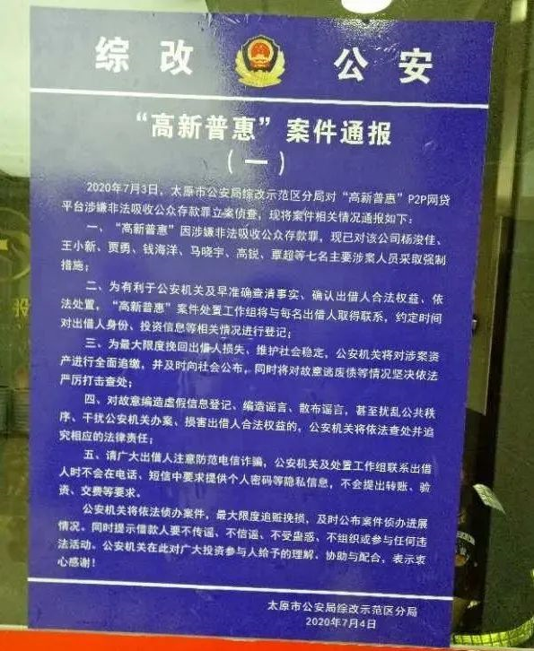 山西省太原市公安局综改示范区分局发布案件通报显示,7月3日,对“高新普惠”P2P网贷平台涉嫌非法吸收公众存款罪立案侦查,现已对该公司杨浚佳、王小新、贾勇、钱海洋、马晓宇、高锐、覃超等七名主要涉案人员采取强制措施。