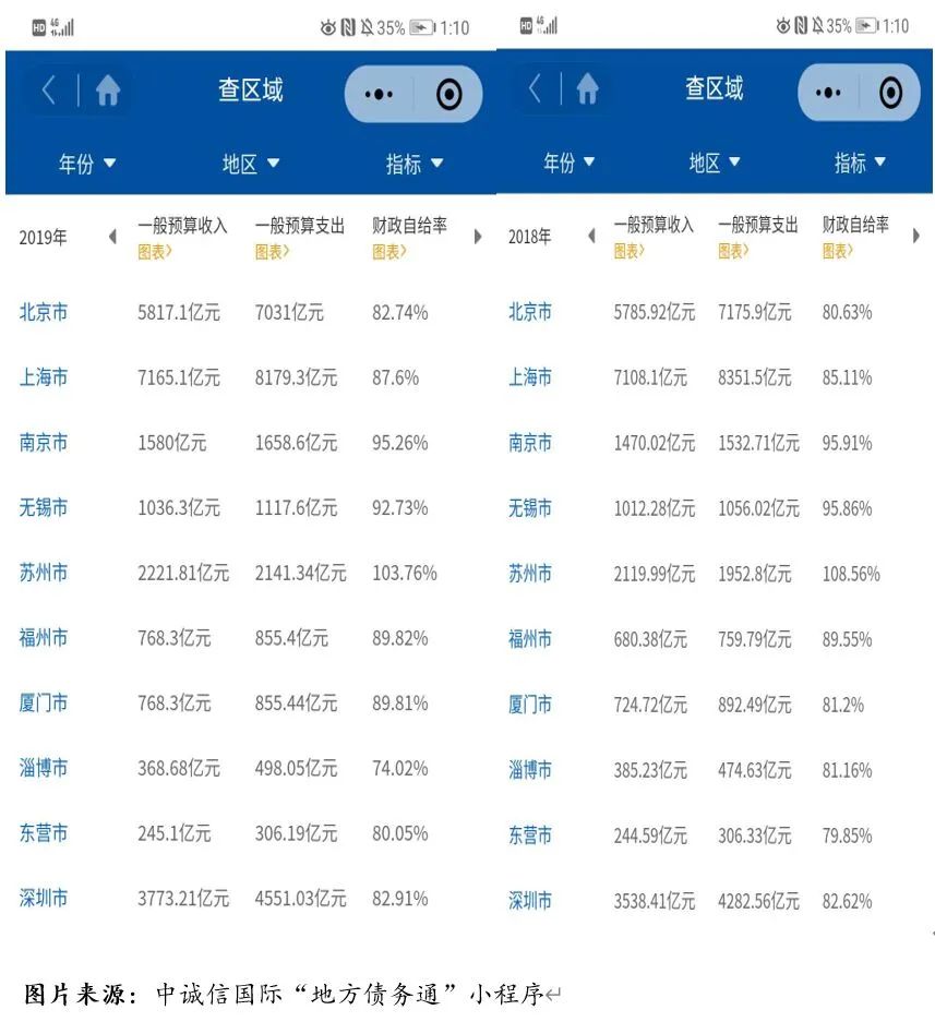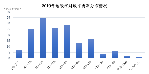 从地级市财政平衡率排名情况看,2019年财政平衡率排名前十的地级市依次为苏州(103.76%)、南京(95.26%)、无锡(92.73%)、福州(89.82%)、厦门(89.81%)、上海(87.6%)、 深圳(82.91%)、北京(82.74%)、东营(80.05%)、淄博(74.02%)。相较于2018年排名前十城市未发生变化,部分城市排名有小幅调整,厦门市由2018年第七名上升至第五名,北京市2018年由第九名上升至第八名。从区域分布看,财政平衡能力较强城市集中于东部沿海的江苏、福建、上海、深圳、北京及山东六个省及直辖市。