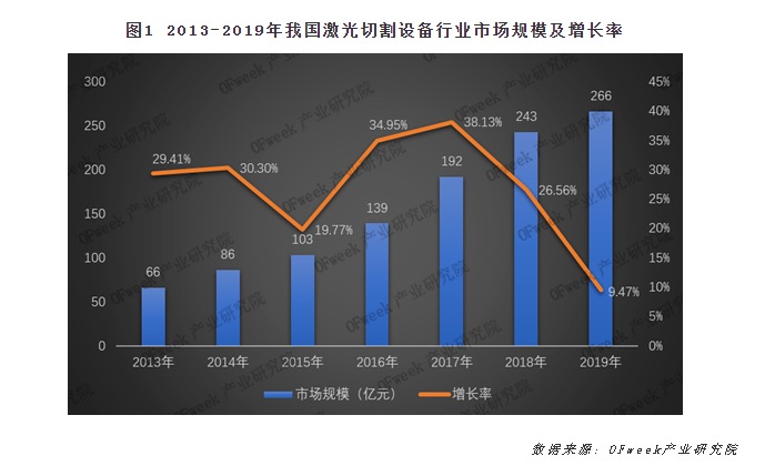 2018年我国激光切割设备行业市场规模达到243亿元,同比增长26.56%。2019年,激光切割设备核心部件激光器价格继续大幅下降,进一步降低了下游行业客户购买激光切割设备成本,部分市场需求得到进一步释放,但同时也受到汽车、3C 消费电子行业周期性下滑、中美贸易摩擦导致的政策波动风险和行业同质化竞争加剧的不利影响,国内激光切割设备需求大幅放缓,汽车、3C等部分领域需求呈下降趋势,2019年我国激光切割设备市场规模为266亿元,增速降至个位数9.47%。