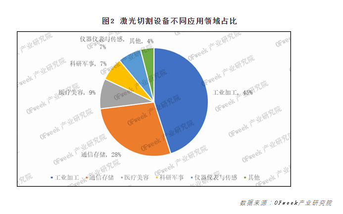 我国激光切割设备应用的终端行业广泛,目前激光切割主要还是应用于工业材料加工和通信存储行业,分别占45%、28%,其次是医疗美容和科研军事领域,分别占比9%和7%。激光切割设备下游产业中,中低功率激光切割设备用于机箱机柜,门业、五金制品,电子行业,家电厨具,广告装饰业等行业较多;高功率激光切割主要用于轨道机车、船舶行业、汽车行业的零部件制造,重型机械、模型制作,石油管道、建筑行业等。目前,光纤激光切割在一般的金属加工行业已成为一种市场趋势,广泛应用于钣金金属加制作、厨灯具、锯片、厢板、金属、纺织机械、粮食机械疗器械表等行业。特别是在钣金业许多数中加工方式,深受行业用户的青睐。