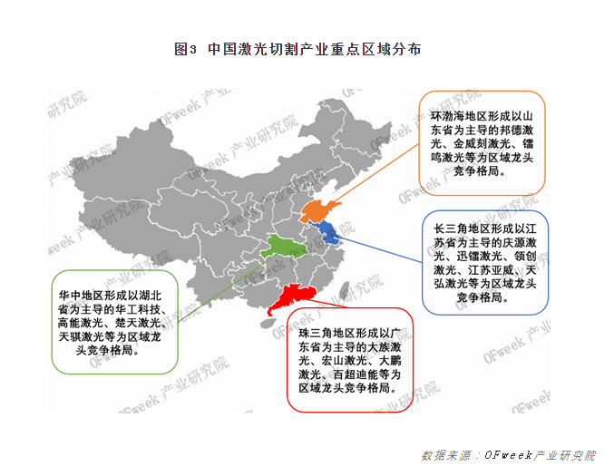 激光切割企业主要集中在湖北、山东、江苏、上海和广东等经济发达省市。从激光切割产业区域分布来看,中国已基本形成以上述省市为主体的四大激光产业群,分布在华中、环渤海、长三角、珠三角四个地区。四大区域激光切割设备厂商约占国内总市场90%份额。