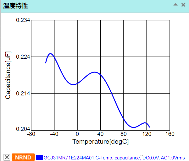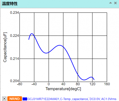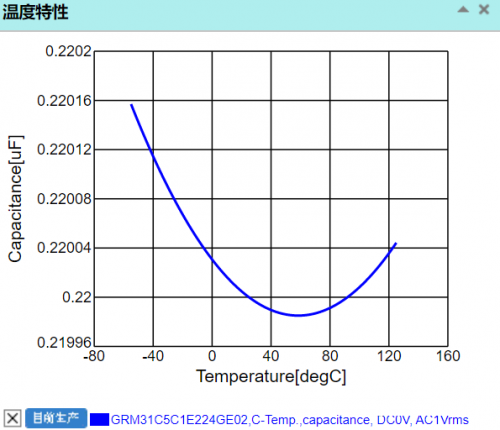 下图中,为 1206 封装、C0G 温度特性、25V 耐压、0.22μF 电容的电容值随温度的变化曲线。在全部规格要求的温度范围之类,电容的最小值为 0.21996μF,最大 0.22016μF,误差非常小。