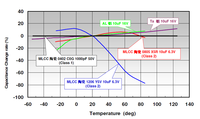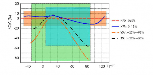 在一些厂家的官网已经找不到相应的选型规格。下图为 NP0、X7R、Y5V、Z5U 的温度特性对比曲线。