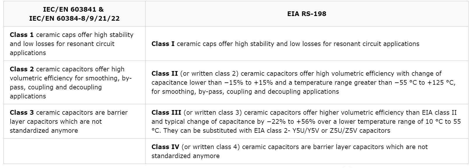 MLCC 温度特性由 EIA 规格与 JIS 规格等制定。分类表,如上图所示,5U/Y5V 、Z5U/Z5V 也已经改为归为第二类,其实也很多场景不再使用。所以,通用 MLCC 大致可分为 I 类(低电容率系列、顺电体)和 II 类(高电容率系列、铁电体)两类。